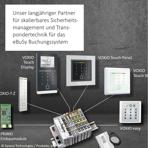 Die Steuerung Zutrittskontrollanlagen erfolgt über das gebäudeinterne Kommunikationsnetzwerk und dem dezentralen eBuSy Online-Buchungssystem unseres Kooperationspartners productive web GbR.